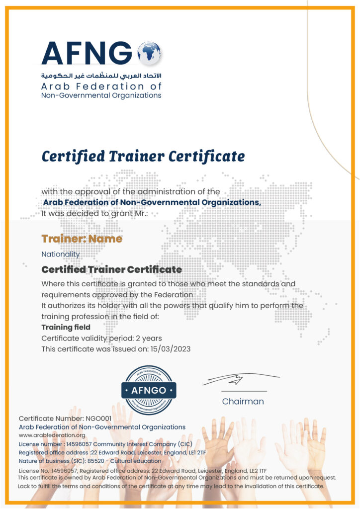 لا يُعتبر الاتحاد العربي للمنظمات غير الحكومية مسؤولاً قانونياً أو مادياً عن سوء استخدام هذه الشهادة أو تجاوز الصلاحيات الممنوحة لها. وفي حال مخالفة ذلك، يتحمّل حامل الشهادة لهذه المسؤولية، وتُعتبر شهادته ملغية جراء هذا التصرّف.