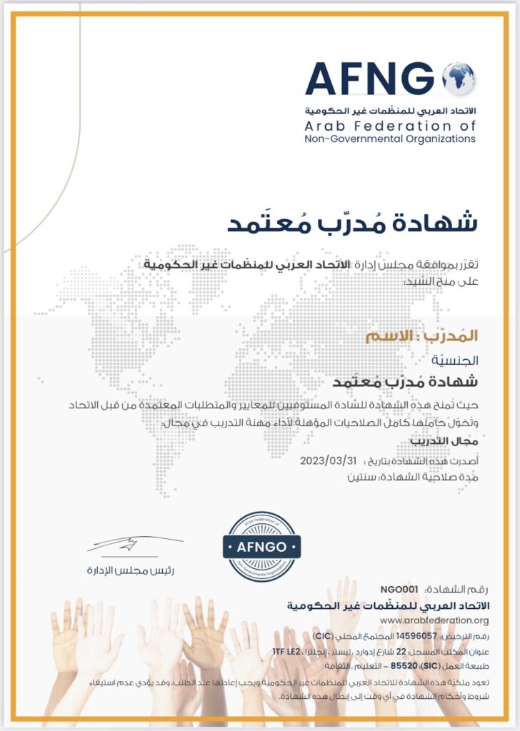 في سبيل دعم الاتحاد العربي للمنظمات غير الحكومية للسّادة الأعضاء الراغبين باعتماد رسمي يدعم مسيرتهم المهنية في مجال تقديم خدمات الاستشارات ضمن تخصصات عملهم المتوافقة مع مظلة نشاطاتنا.
